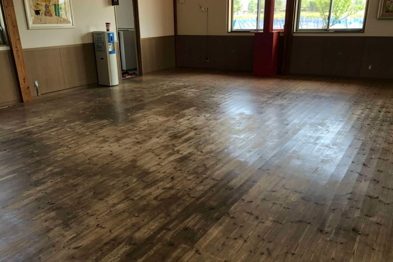 床、フローリングの表面にウレタンの 保護膜を作りコーティングします。 耐摩耗性に優れ、とくに人の歩行が 多い店舗や体育館などに適した 仕上げ方法です。